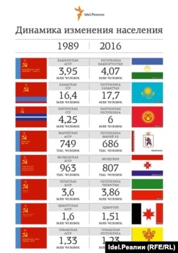 По итогам Всесоюзной переписи населения в 1989 году в республике проживало 3,6 млн человек. 48% - татары, 43,2% - русские.