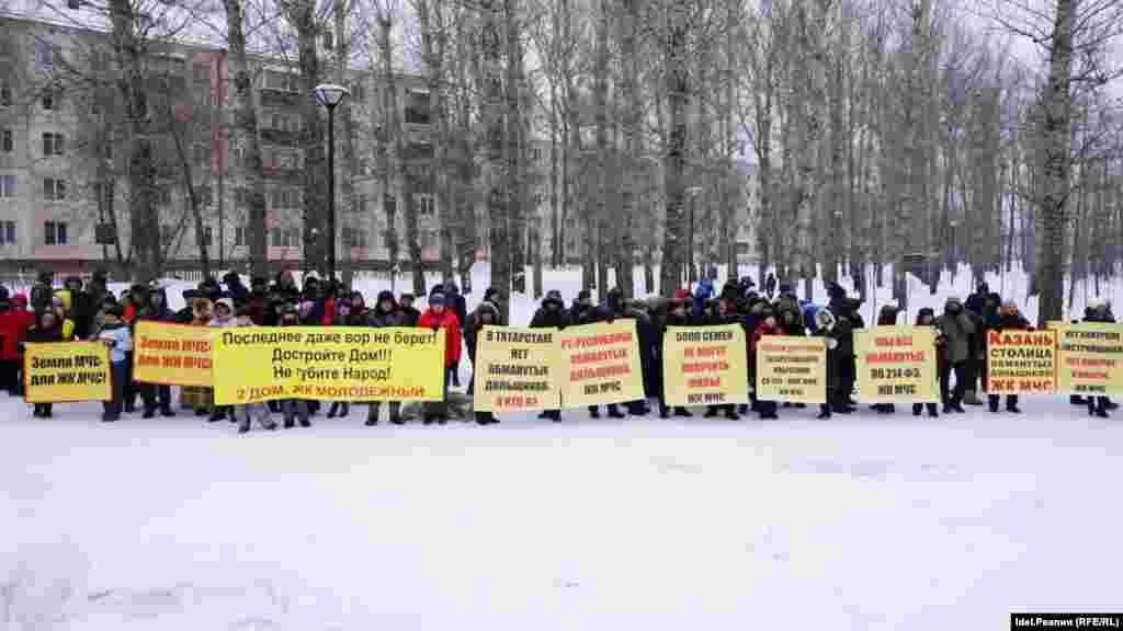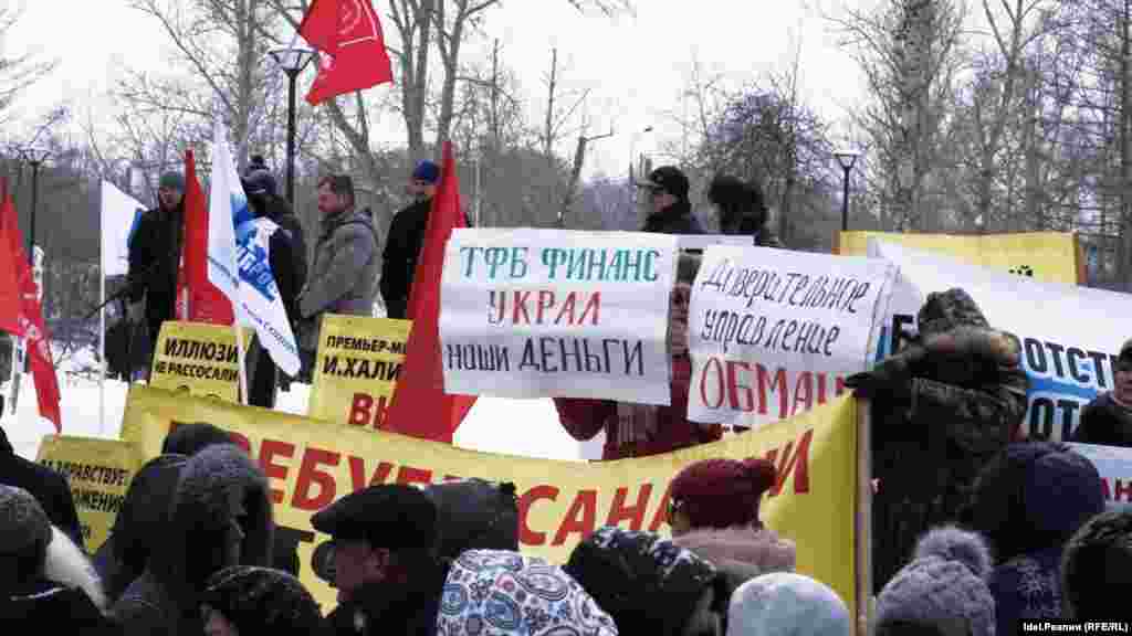 Митинг реготделения КПРФ и Союза профсоюзов СОЦПРОФ сегодня объединил вокруг себя сразу несколько групп протестующих — клиентов Татфондбанка и Интехбанка, дольщиков ЖК "Молодежный" и ЖК МЧС, жителей Осиново, чьи дома определили под снос, "детей войны" и жителей домов на Фучика, где власти забрали придомовую территорию для стоянки. Акция прошла в сквере им. Карима Тинчурина и собрала более 500 человек.