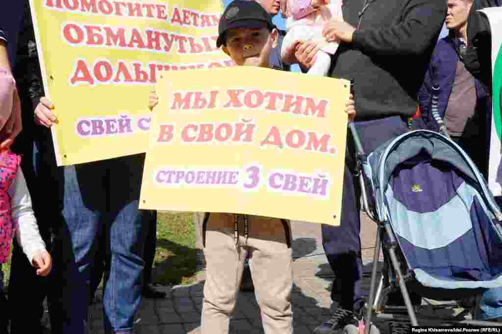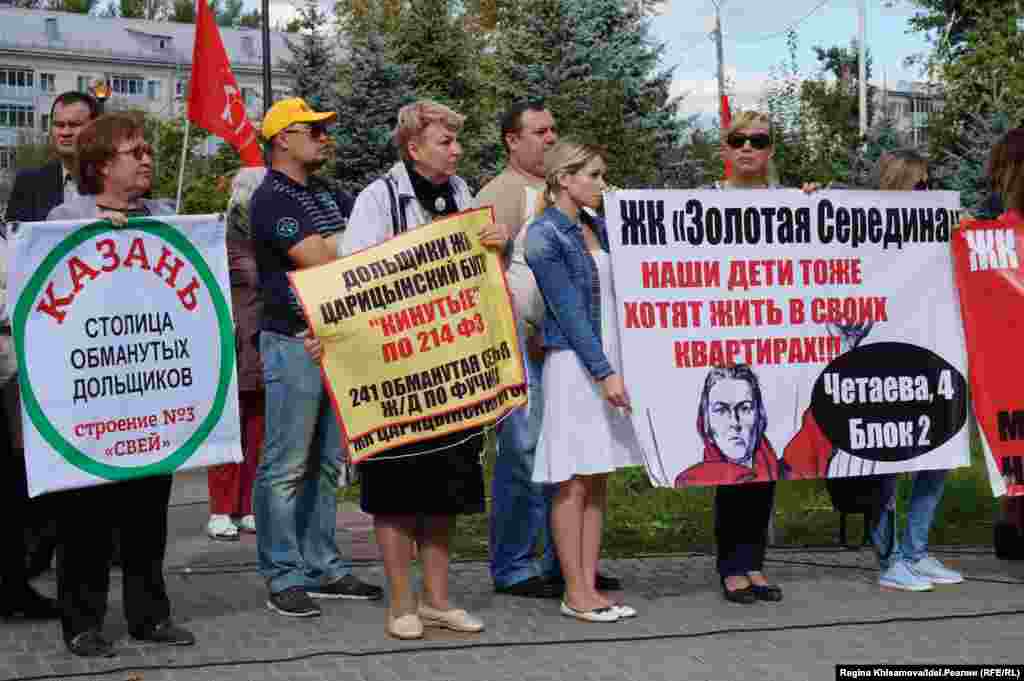 "Казань — столица обманутых дольщиков!", "Мы хотим в свой дом!", "Президент РТ, спасибо вам за мое бездомное детство", "Ждем возобновления строительства", "Наши дети тоже хотят жить в своих квартирах" — с такими плакатами вышли митингующие. Смотрите другие наши фотогалереи здесь.