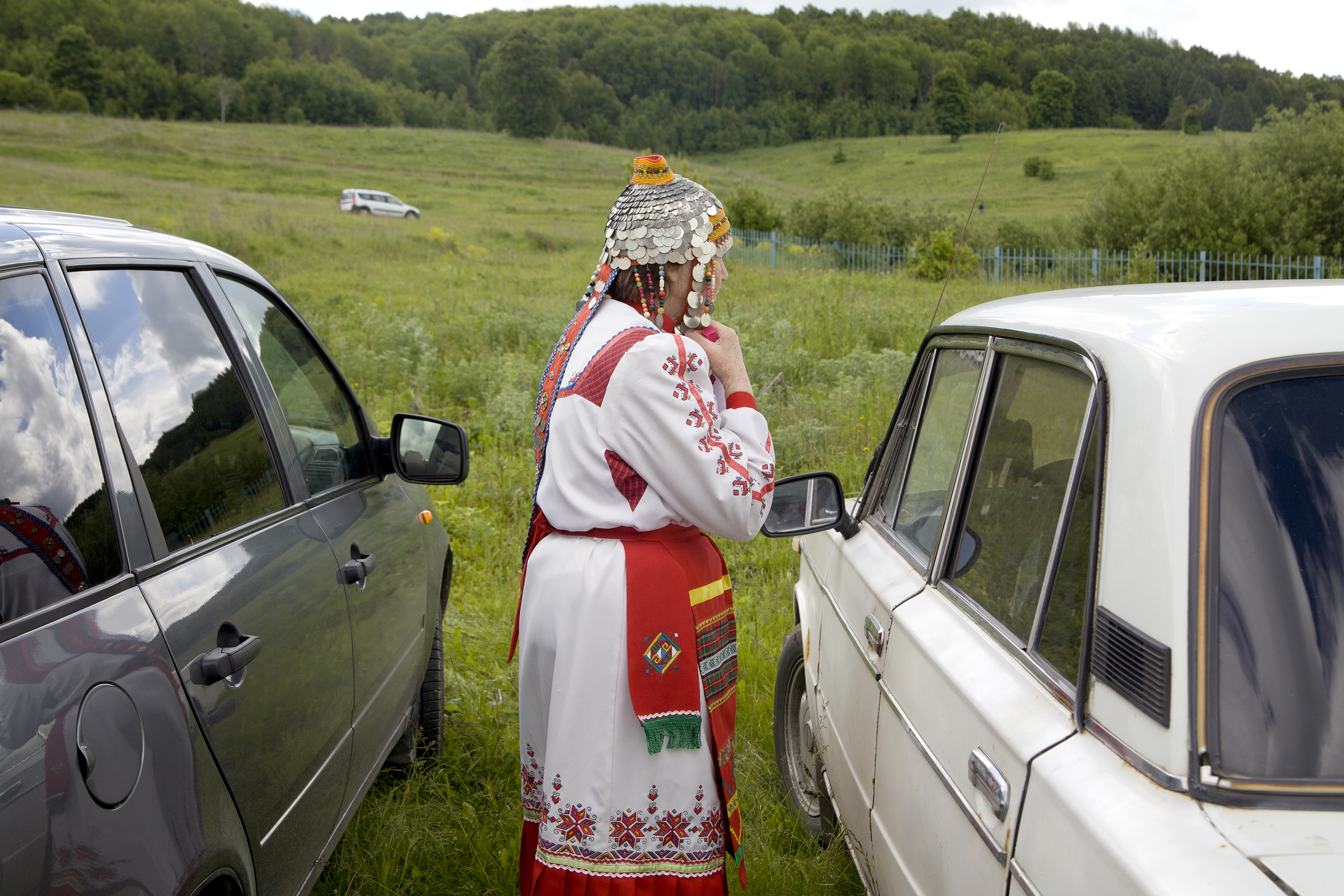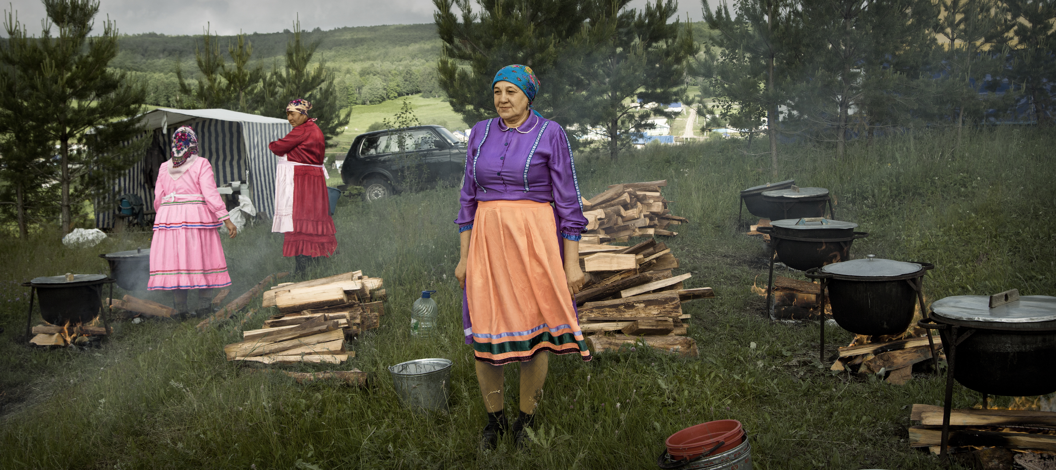 Рано утром на одном из зеленых холмов у села, где из-под земли бьет священный для местных чувашей родник, собралось с два десятка человек в национальной одежде. Их видно издалека — почти все они в красном или розовом одеянии, а с высокого холма уходят ввысь столпы дыма от десяти костров. На каждом из них котлы, в них — закипает вода.