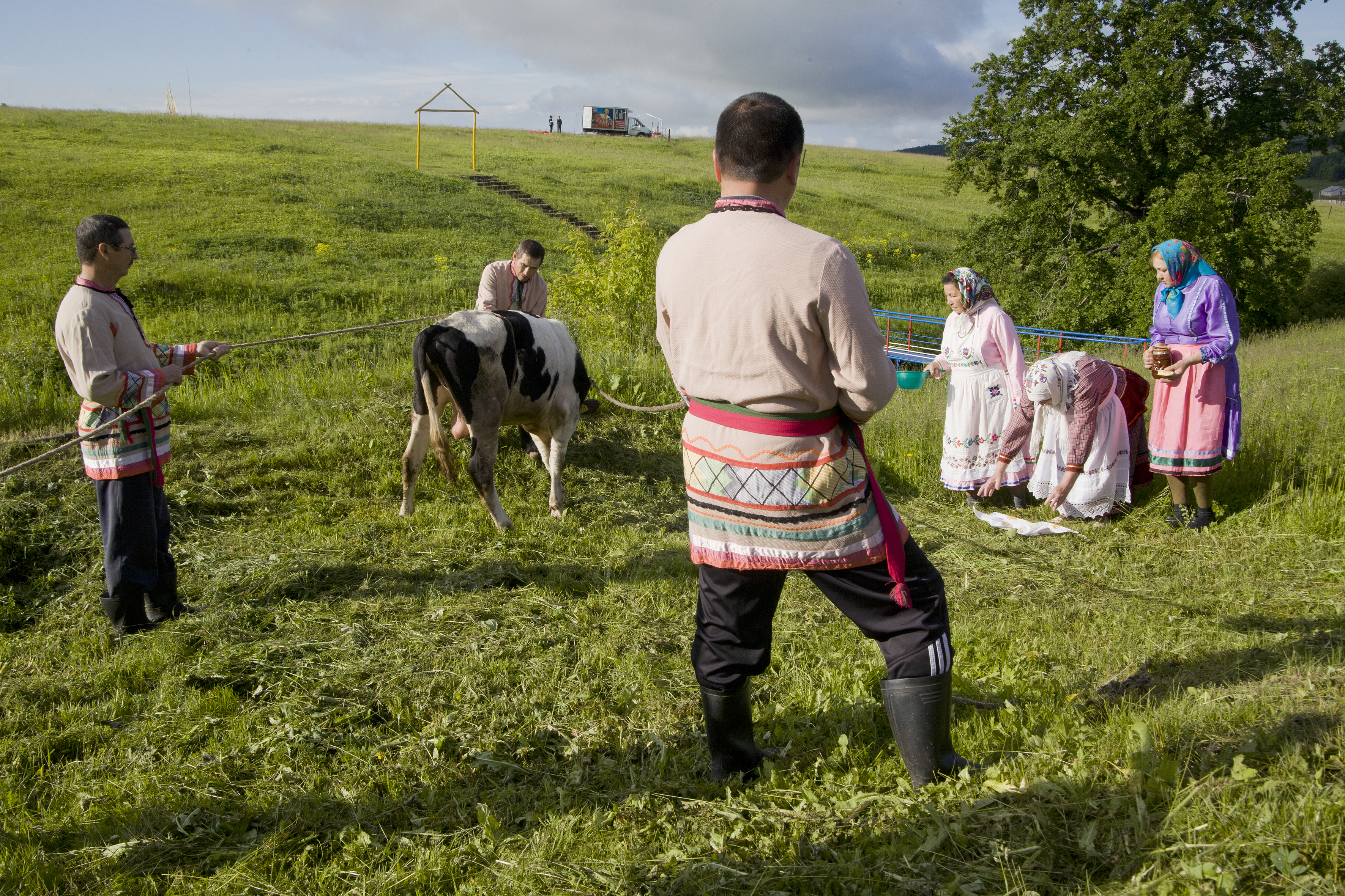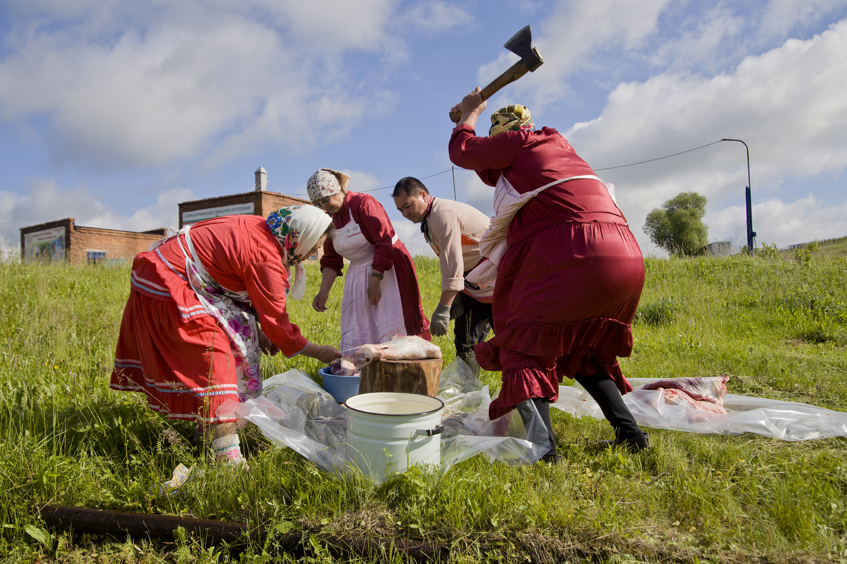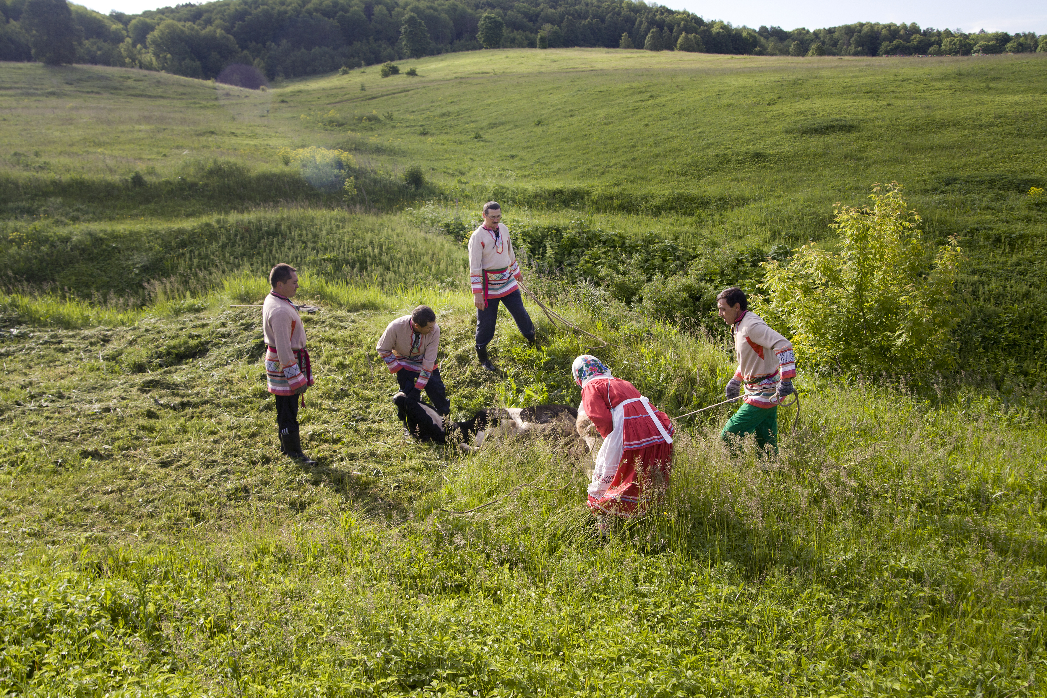 Трое мужчин остаются на поляне и разделывают тушу. Чувашские религиозные предписания запрещают показывать ритуал заклания животных детям, молодым женщинам и девушкам (резали животных в особых, закрытых деревьями местах).