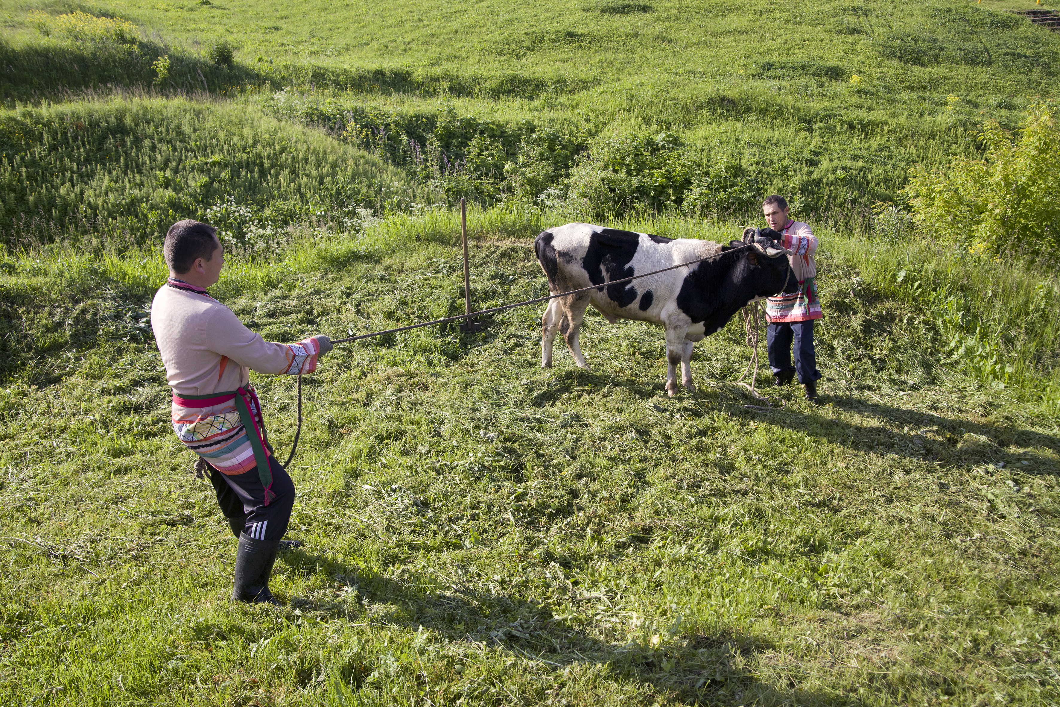 Мужчины держат бычка за веревки, женщины начинают читать молитву. Все, что они принесли к бычку, у них в руках.
