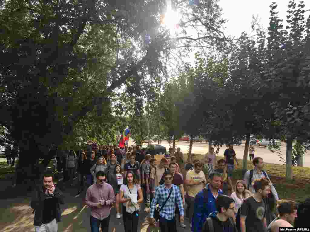 Участники шествия идут по Казани, скандируя: "Путин - вор!", "Верните наши деньги!" Некоторых участников задержали.