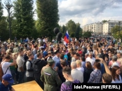 Толпа, выкрикивая "Путин вор", "Пенсионный грабеж", "Долой царя", продолжает шествие. На пересечении улиц Татарстан и Тукая сотрудники в касках выстраиваются шеренгой и преграждают путь протестующим. Мужчина в голубой рубашке пытается пройти через толпу бойцов, заявляя, что это "моя земля", но его не пускают.