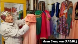 Сотрудник единственного в России музея калмацкой культуры Джамиля Тартыкова показывает национальные костюмы. Здесь же – деревянная кровать, сделанная без единого гвоздя, калмацкая маслобойка, выточенная из цельного куска лиственницы, и пожелтевшие листы Корана, на которых за 200 с лишним лет не стёрлось ни одной буквы.