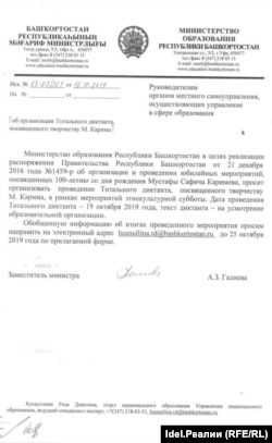 В нем ведомство приказывает всем в срочном порядке именно 19 октября организовать диктанты, посвященные Мустаю Кариму на русском и башкирском языках. Датирован документ 16 октября, это за три дня до татарского диктанта. Разнарядка была спущена во все районы и города, и к делу подключился мощный административный ресурс.