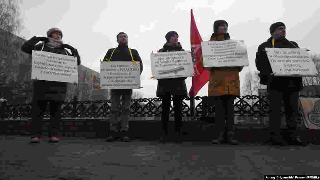 В воскресенье, 17 ноября, вышли на массовый пикет жители казанского микрорайона "Танкодром", который городские чиновники обещают "благоустроить" путём сноса частных домов. Пикет прошел "у фонтана" на улице Карбышева — так называется небольшой искусственный водоём внутри микрорайона, фонтан в котором давно уже не работает: его-то как раз, несмотря на многочисленные обращения жителей, всё никак не благоустроят.