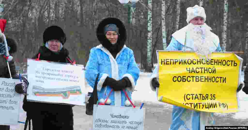 В последнее воскресенье уходящего 2019-го жители казанского микрорайона Танкодром вновь вышли на акцию протеста. На сей раз — в новогодних нарядах костюмах снегурочек и дедов морозов и мишурой, накинутой на плечи. Правда, настроение собравшихся было совсем не новогодним, в руках люди держали те же плакаты, что и два месяца назад — с просьбами не сносить их дома и чтить частную собственность.