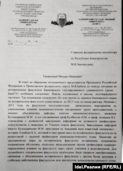 В начале письма говорится, что оно написано в ответ на обращение полномочного представителя президента РФ в Приволжском федеральном округе Михаила Бабича по поводу ситуации на историческом факультете БашГУ и что факты, отраженные в этом запросе, подтверждаются частично. Какие именно факты подтвердились, а какие — нет, неясно. Однако в письме этом приводятся сведения, из которых становится понятной логика ликвидации исторического факультета.