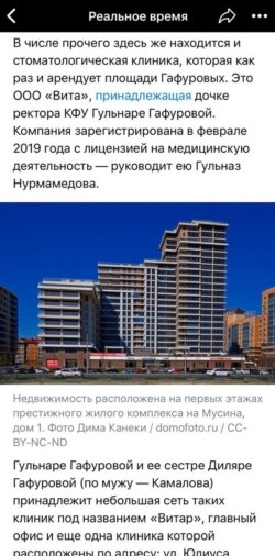 "Родня Ильшата Гафурова построила успешную сеть стоматологий, которую вуз рекламирует студентам, занимается управлением жилым фондом и научными разработками в сфере медицины", ― сказано в введении в материал (расследование есть в распоряжении "Idel.Реалии"). Далее побробно описаны бизнесы, принадлежащие семье ректора и недвижимость Гафуровых.