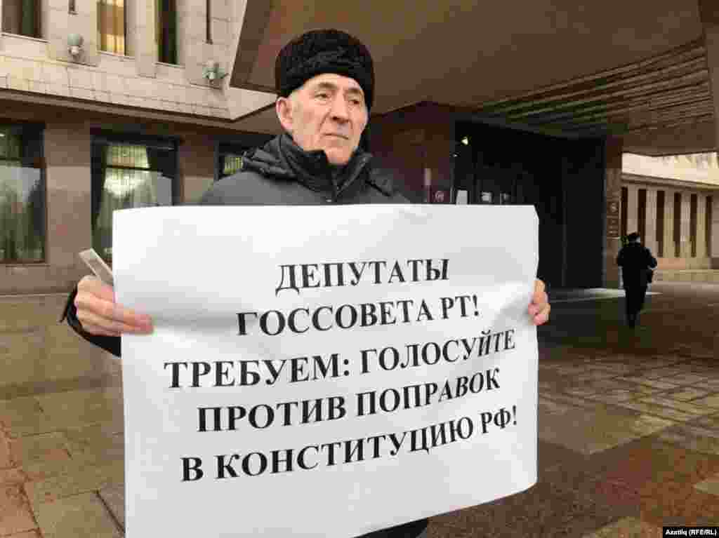 Сегодня, 12 марта, на сессии Госсовета РТ, поправки к Конституции вынесены на голосование. Активисты вышли с одиночными пикетами, призывая депутатов голосовать против. 11 марта, Депутаты Госдумы в третьем, окончательном, чтении приняли поправки. Среди них есть поправка о русском языке. "Государственным языком РФ на всей ее территории является русский язык как язык государствообразующего народа, входящего в многонациональный союз равноправных народов Российской Федерации". Эксперты в национальных республиках уже выразили свое мнение, что данная поправка противоречит духу нынешней Конституции, демократии и федерализма. Также состоится голосование по обнулению президентских сроков.