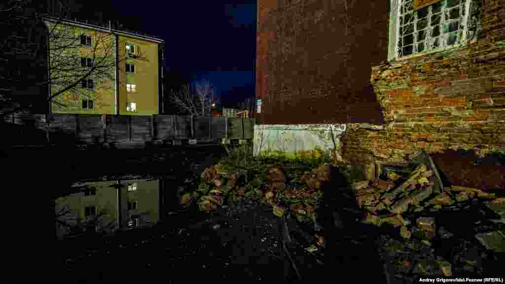 Журналисты "Idel.Реалии" успели побывать в здании в ночь накануне окончательного сноса — несмотря на то, что к тому моменту девелопер уже успел частично разрушить боковые стены, строение, официально объявленное "аварийным", по-прежнему крепко стояло на фундаменте. Общественники и краеведы всё еще надеялись, что компромисс будет найден и баню удастся сохранить.