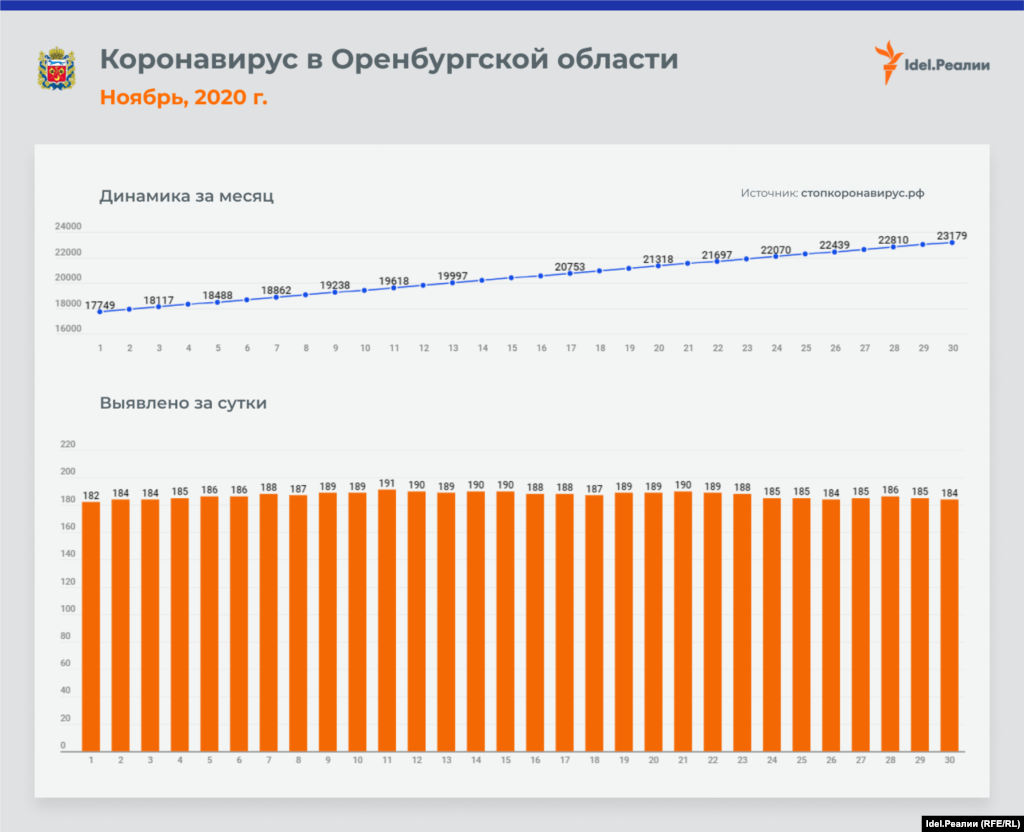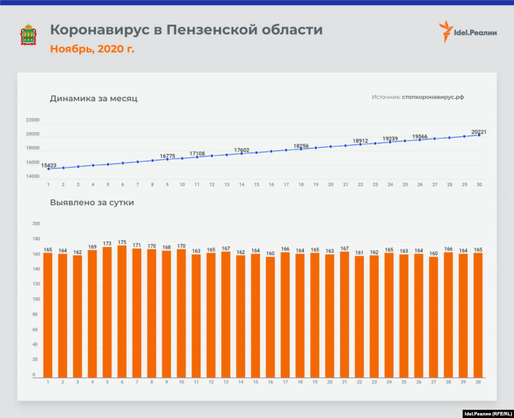 Если в начале месяца в Татарстане ежедневно выявлялось 45 случаев заражения коронавирусной инфекцией, то к концу ноября эта цифра почти удвоилась — до 84-х. В процентном соотношении это наибольший рост среди всех регионов Приволжского федерального округа — наряду с Чувашией и Пермским краем. А вот в Оренбургской и Пензенской областях на протяжении всего месяца цифры практически идентичные: ежедневно выявлялось чуть ли не одинакое количество случаев инфицирования.