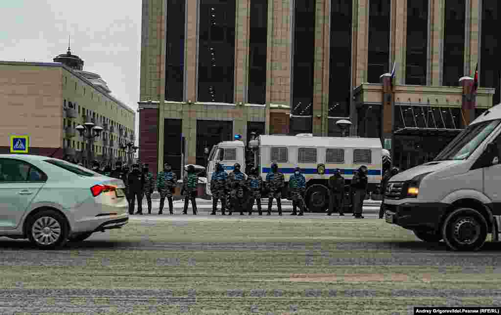 Изначально участники протеста в Казани планировали пройти по пешеходной улице Баумана от часов к кремлю — но это удалось далеко не всем. В два дня, 23 января, площадь с часами заняли полиция с росгвардией, а саму Баумана — перекрыли. Стихийно родилось предложение — идти на площадь Свободы, к Кабмину РТ. Такое отступление от планов, судя по всему, оказалось неожиданным для силовиков. Протестующие заняли площадь напротив дома правительства раньше, чем туда успели стянуть полицию с росгвардией.