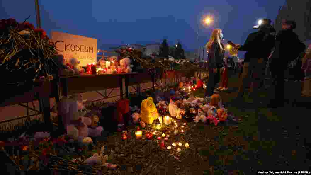 Казанцы до поздней ночи несли цветы, мягкие игрушки и свечи к школе, которая 11 мая подверглась атаке вооруженного ружьём 19-летнего парня. Уже в восемь вечера импровизированный мемориал утопал в цветах и плюшевых мишках. Он был организован на газоне наискосок от школы. К самому учебному заведению многочисленных казанцев не подпускала полиция.