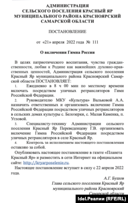 Постановление №111 подписано главой сельского поселения Алексеем Бушовым. Документ поручает руководителю МКУ "Культура" Альбине Вальковой организовать трансляцию в сёлах Белозёрки, Малая Каменка и посёлке Угловом. А специалист-техник Глеб Переведенцев организует звучание государственного гимна Красном Яру.