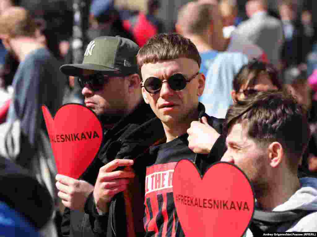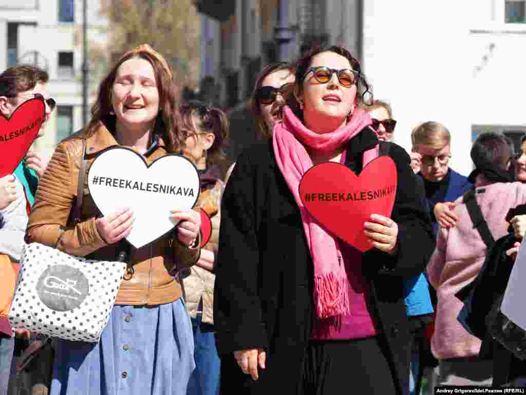 Участникам акции раздали сердечки с хештегом #freekalesnikava, эти сердечки люди во время митинга то и дело поднимали высоко над головами.