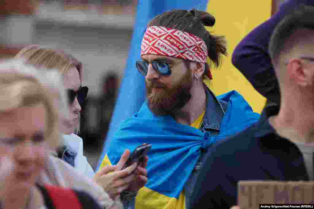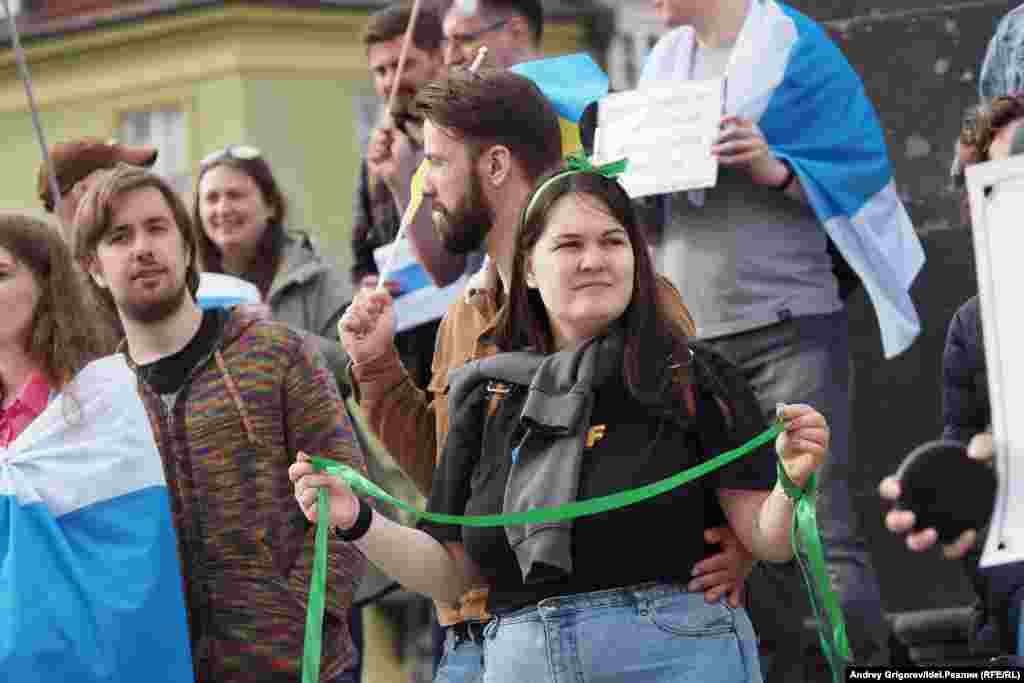 Собралось несколько десятков человек, к акции примкнули и несколько украинцев с белорусами. В этот раз выступающих на митинге не было. Участники митинга выкрикивали лозунги, которые тут же подхватывали остальные. В какой-то момент начали перечислять украинские города и территории, которые сейчас находятся под полной или частичной оккупацией РФ: "Донецк — Украина!", "Мариуполь — Украина", "Крым — Украина!"...
