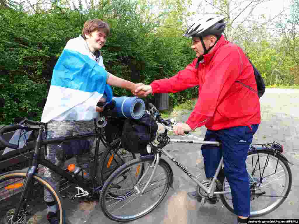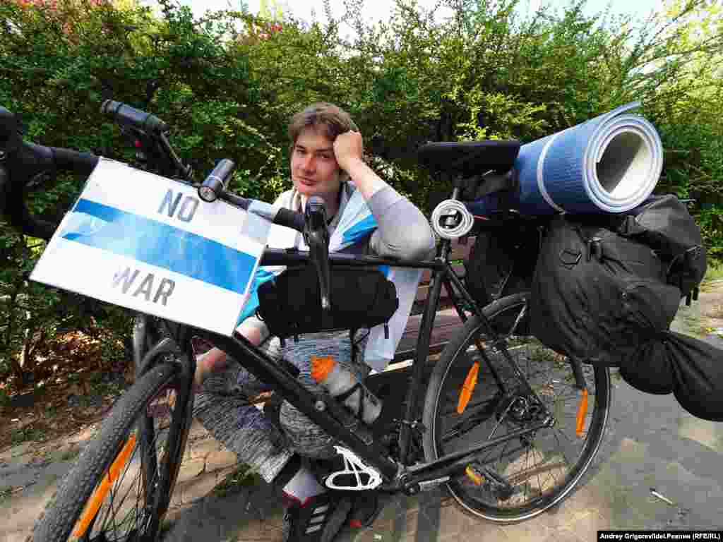 6 марта этот 18-летний парень сел на велосипед, прикрепил к нему российский триколор, плакат "Russians are not Putin" и отправился колесить по Европе. С тех пор он намотал больше трёх тысяч километров, а его флаг стал бело-сине-белым расцветки. Monokov, так он просит называть себя, родился в Нижнем Новгороде, но с шести лет жил в Италии. Конечная точка его путешествия — Россия. Именно поэтому он не хочет разглашать своё настоящее имя.