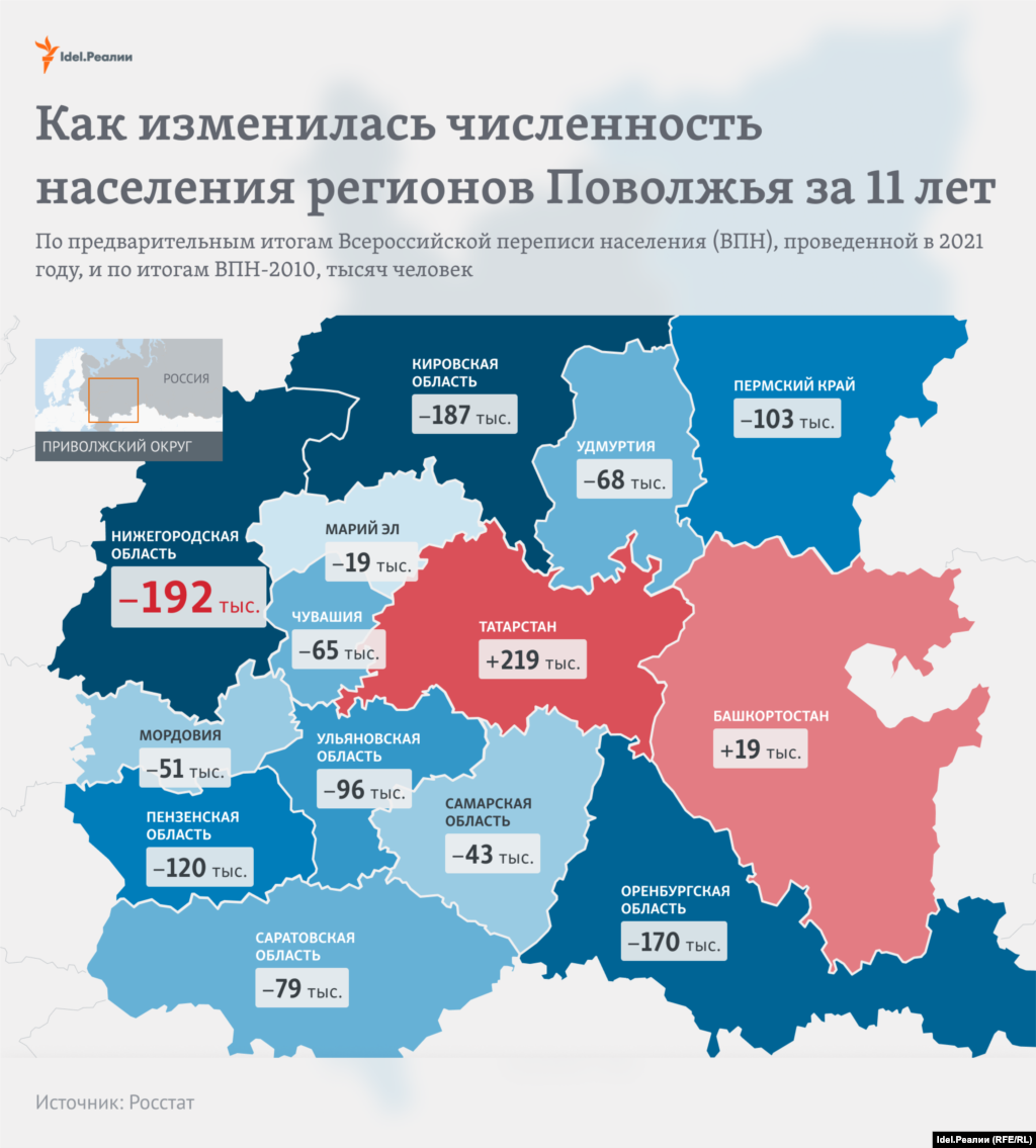 Только в двух регионах Поволжья отметился прирост населения за 11 лет — это Башкортостан (+19 тысяч) и Татарстан (+210 тысяч).