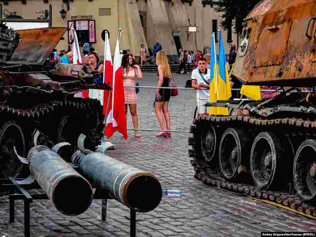 "За вашу и нашу победу!" — так называется выставка, которая открылась прямо под открытым небом на Замковой площади Варшавы в конце июня. На выставке представлена трофейная техника, подбитая украинскими военными весной 2022 года: танк Т-72БА и самоходно-артиллеристская установка 2С19 "МСТА-С". Танк, как следует из пояснений на стенде, был подбит в бою 31 марта на окране села Дмитровка Бучанского района Киевской области. Рядом с танком найдено тело российского танкиста и документы на имя Юрия Дайнзанова. Как гласит надпись на развороте удостоверения, командир танкового взвода лейтенант Юрий Дайнзанов, родившийся 14 февраля 2000, окончил 30 июля 2021 года Казанское высшее танковое командное училище. Место постоянной дислокации войсковой части 46104 — станция Дивизионная под Улан-Удэ в Бурятии.