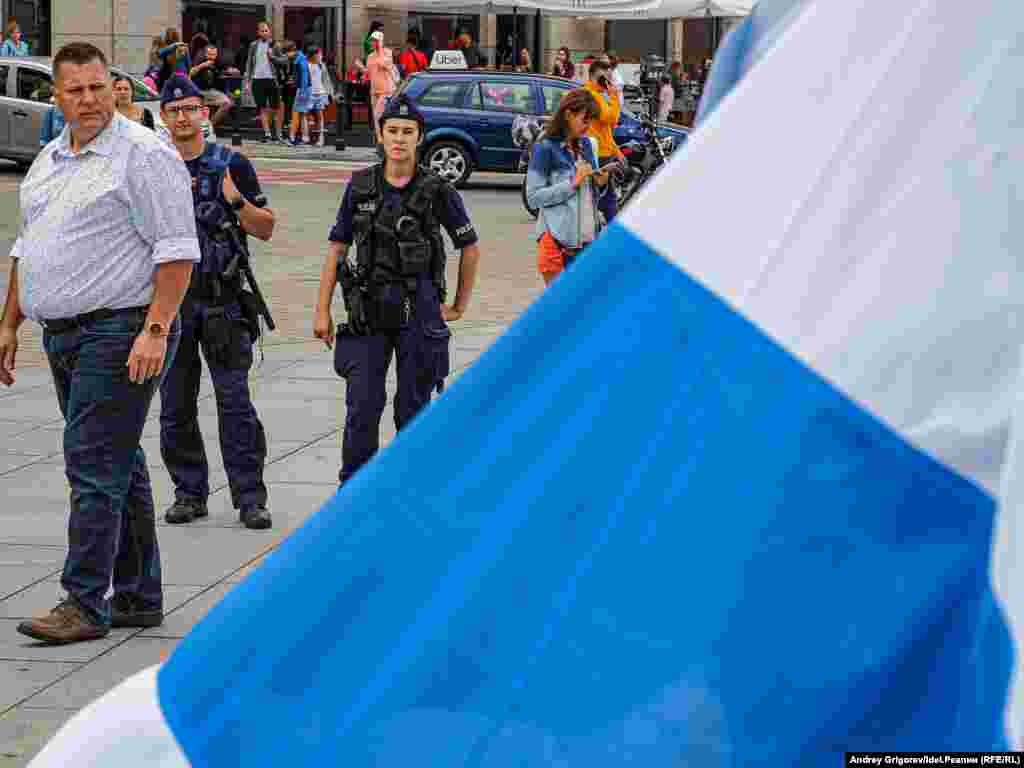 На антивоеную акцию в центре Варшавы вышли два десятка россиян.