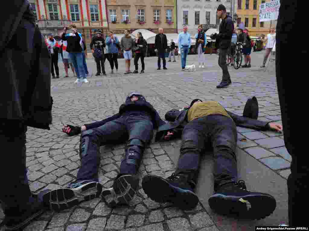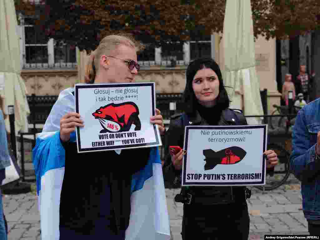 С начала нападения РФ на Украину россияне, живущие во Вроцлаве, проводят у городской ратуши театрализованные акции протеста. Очередная, в сентябре, была посвящена минувшим российским выборам. Участники постановки предлагали прохожим проголосовать.