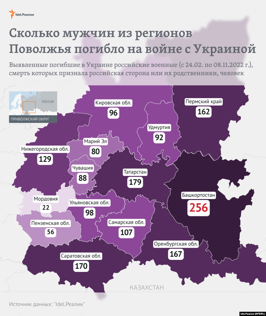 По подсчетам "Idel.Реалии" на 8 ноября 2022 года, на войне погибли как минимум 1 764 человека из республик и областей Поволжья, смерть которых так или иначе признала российская сторона.