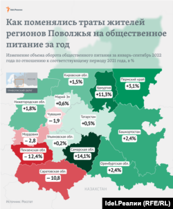В январе-сентябре 2022 года оборот общепита снизился по сравнению с тем же периодом прошлого года местами до 12%. Так, в Пензенской области падение составило 12,4%, в Саратовской области — на 10,8%.