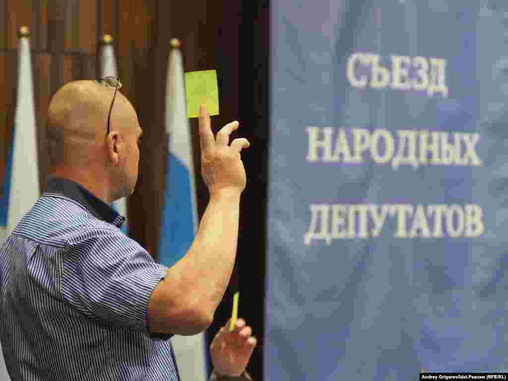 Кроме того, на съезде депутаты последний раз голосовали мандатами — зелёными листочками бумаги (см. фото) — на смену им пришло мобильное приложение.