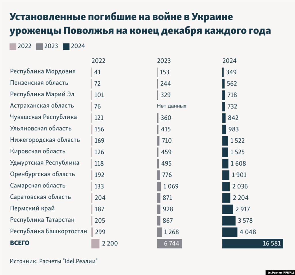 "Idel.Реалии" за неполных три года войны установили имена 25 525 выходцев из Поволжья. Большую часть из них установили в 2024 году — 16 581 имя. За 2023 год всего было 6 744 имен, за 2022-й — 2 200.