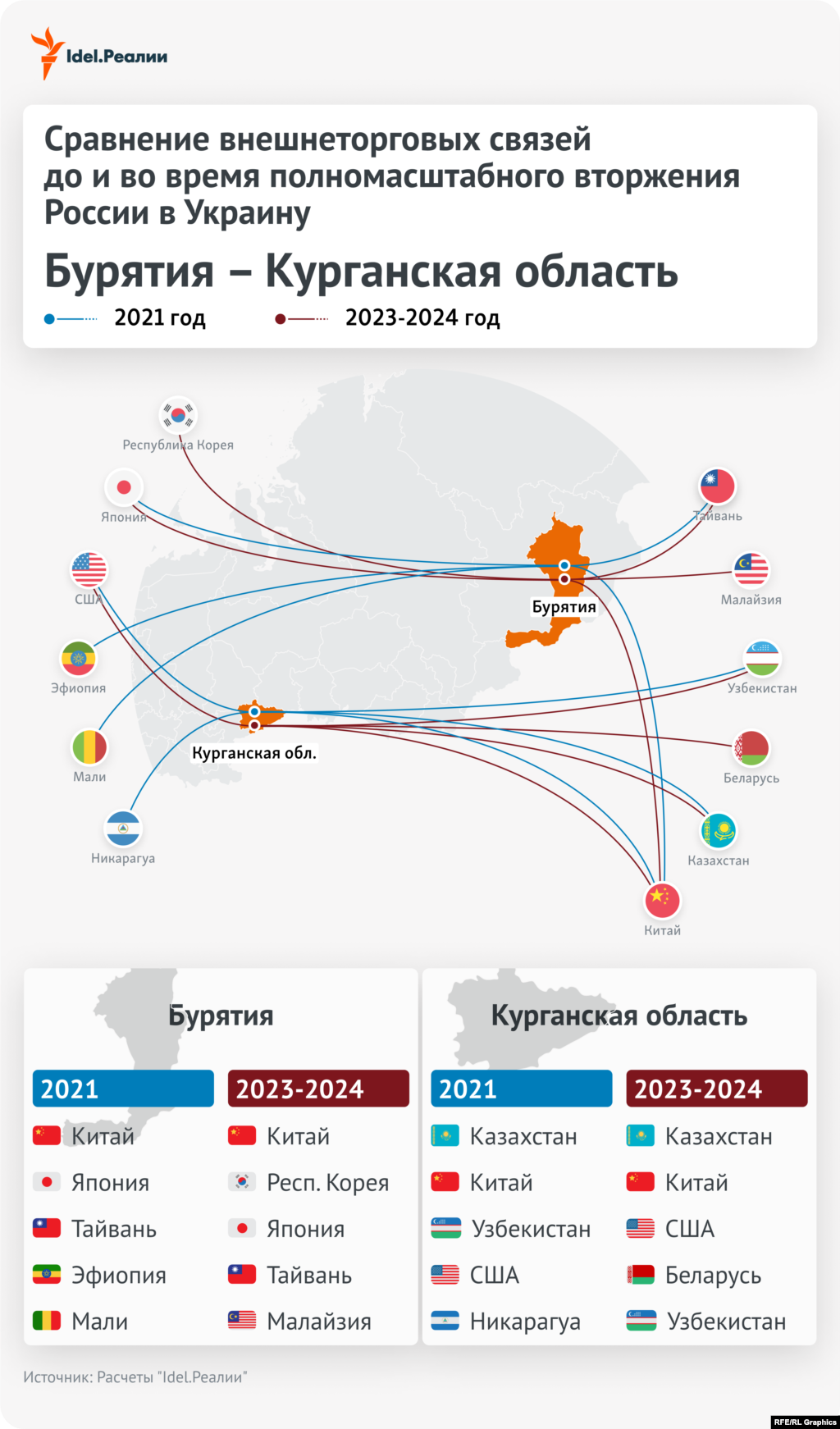 "Idel.Реалии" проанализировали, как полномасштабная война России против Украины повлияла на внешнеэкономические связи 14 регионов. Половина из них — национальные республики, другая половина — области. В исследование не вошли регионы, граничащие с Украиной.