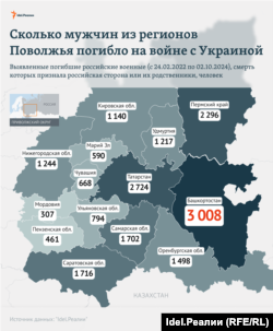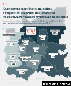 На втором месте в Поволжье — Татарстан с 2 724 погибшими. По данным "Медиазоны" и Русской службы Би-Би-Си, которые также ведут подсчет, Татарстан в целом по России занимает четвертое место (журналисты на 27 сентября установили имена 2 378 погибших из республики).
