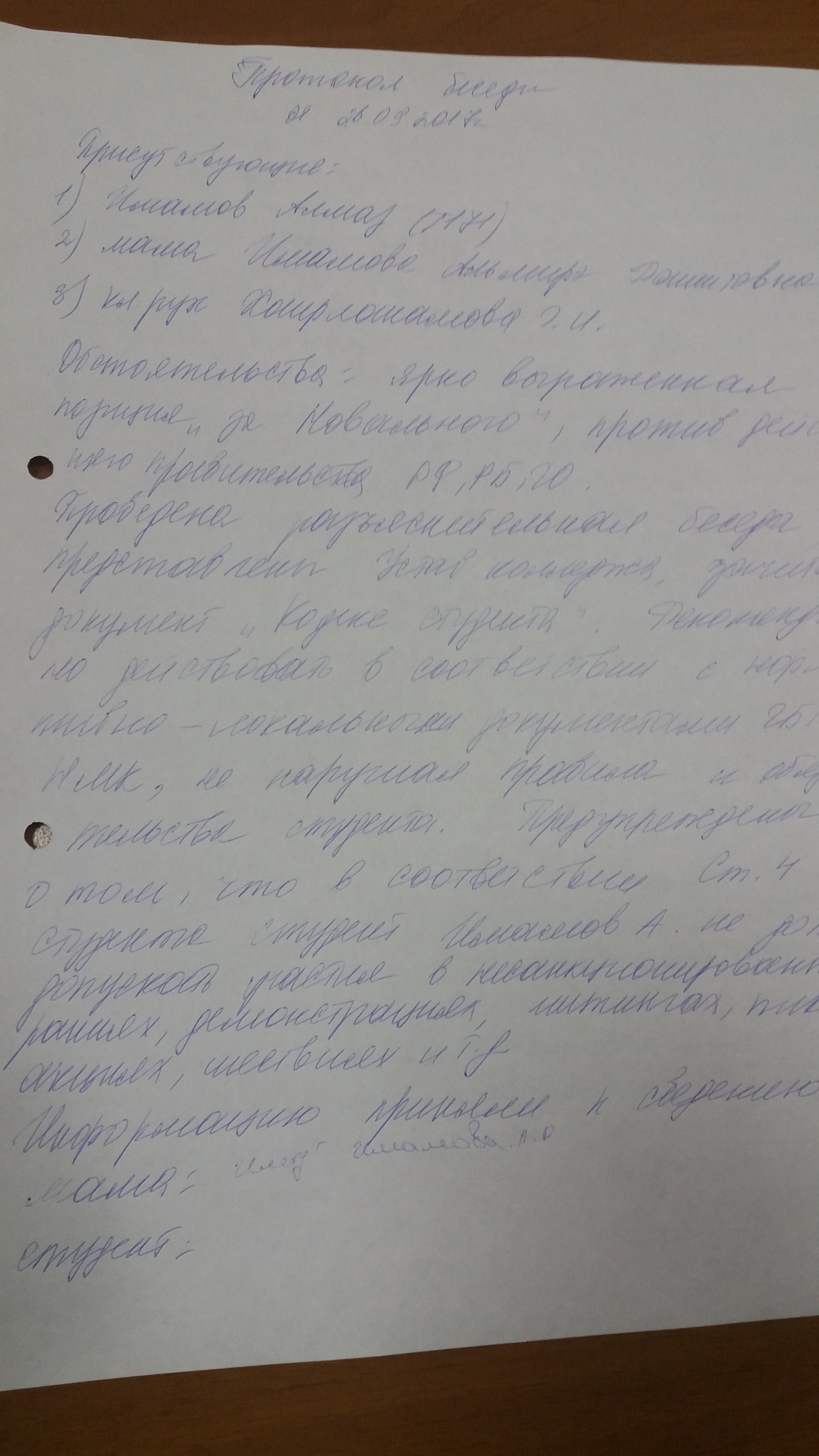 Первокурснику Нефтекамского машиностроительного колледжа Алмазу Имамову пригрозили отчислением и другими неприятностями за участие в митингах в поддержку Алексея Навального. Только в сентябре студента три раза вызывали в дирекцию колледжа и проводили с ним "воспитательные" беседы. Одну из таких бесед, на которую была приглашена и его мама, Алмаз Имамов записал на диктофон и выложил в Youtube.